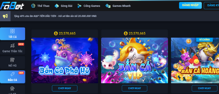Bắn cá là một trong các trò chơi đổi thưởng thu hút nhiều người chơi tham gia hiện nay. Khi người chơi Bắn cá tại nhà cái Fabet thì không cần phải vận dụng đầu óc quá nhiều, chủ yếu là bạn phải khéo léo, tinh mắt và nhanh tay thì mới kiếm được nhiều tiền từ game online này.