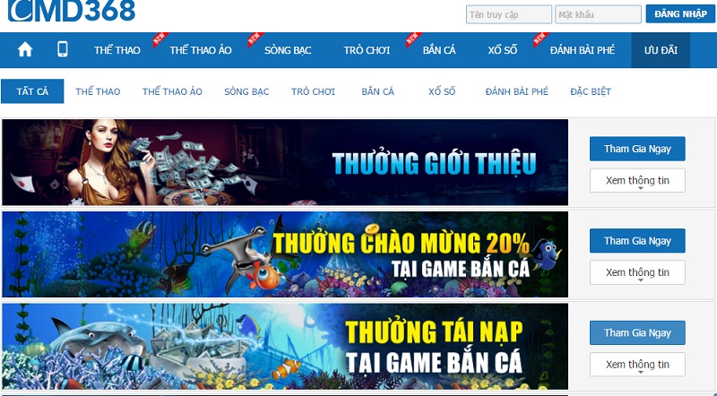 CMD368 còn đưa ra rất nhiều khuyến mãi khác theo các sự kiến lớn trong năm như: World Cup, Asian Cup, C1, Copa America,…. nhằm đảm bảo khách hàng sẽ không cảm thấy nhàm chán khi tham gia tại đây.