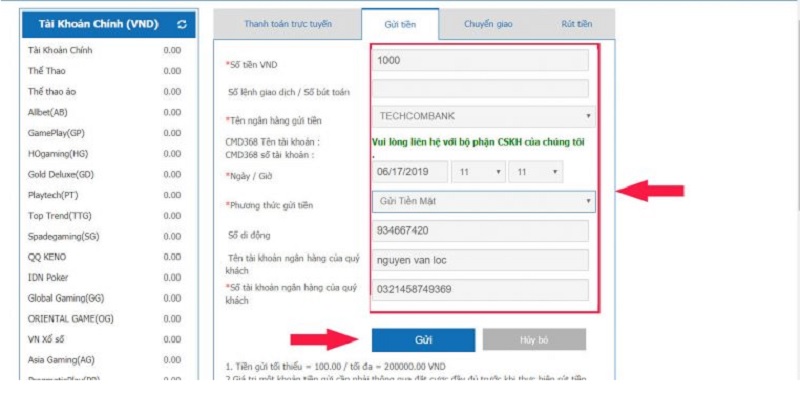Anh em cần liên hệ với hỗ trợ viên cmd368 yêu cầu gửi tiền đồng thời họ sẽ cung cấp số tài khoản và chủ tài khoản của nhà cái.Sau khi chuyển khoản vào đúng tài khoản anh em bước tiếp theo