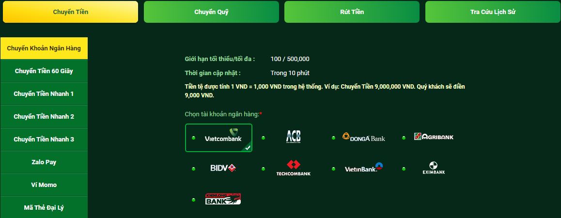 Thành viên có thể chọn các hình thức giao dịch với nhà cái casino uy tín này: Internet Banking, ATM hoặc chuyển tiền tại quầy giao dịch.
