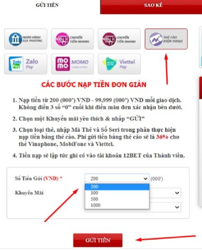 Để tham gia cá cược bóng đá hay chơi casino, bạn phải gửi tiền vào 12Bet và dùng số tiền đó đặt cược các trò chơi. 12Bet hỗ trợ nhiều hình thức chuyển tiền như chuyển khoản ngân hàng địa phương, thẻ cào điện thoại, ví điện tử momo, zalopay, viettelpay.