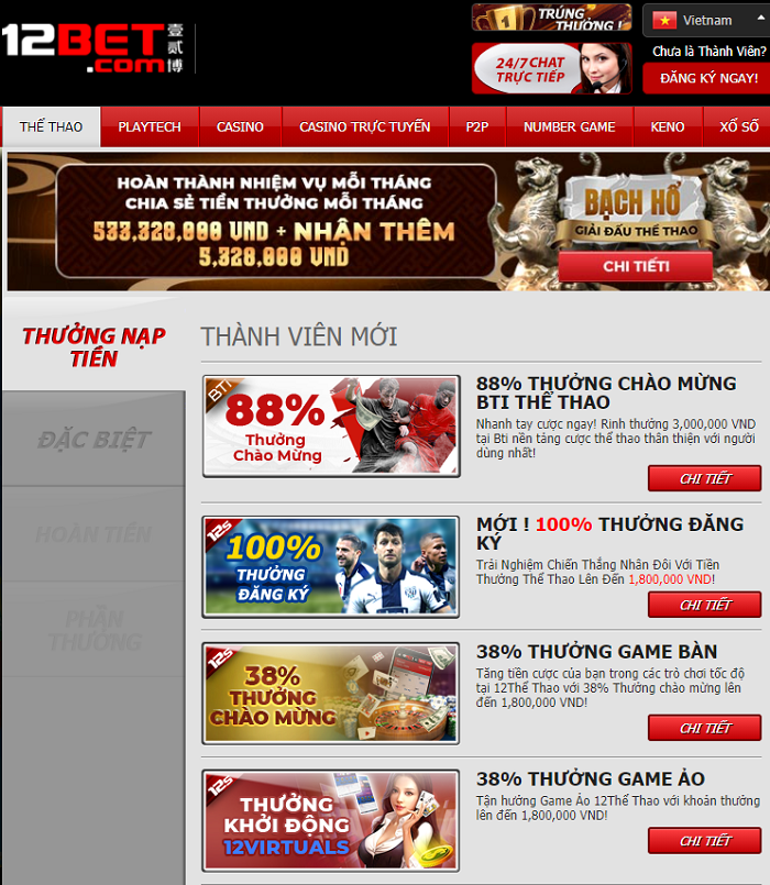Bên cạnh đó, chương trình khuyến mãi chính là sự kiện được người chơi đón chờ nhất. Đây cũng là phương thức để nhà cái thu hút đông đảo sự quan tâm của mọi người chơi. Tất cả mọi thành viên của 12Bet đều có cơ hội tham gia chương trình ưu đãi của nhà cái kể cả là người chơi mới đăng ký. Vì vậy rất nhiều game thủ có hứng thú với 12Bet và có ý định đăng ký tham gia nhà cái này.