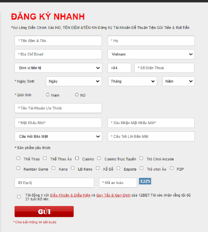 - Ngày sinh: điền chính xác ngày/tháng/năm sinh của bạn để nhận ưu đãi từ nhà cái 12Bet và xác minh bạn đủ tuổi tham gia vào nhà cái.