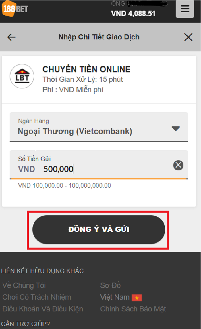 Bước 2: Chọn ngân hàng của bạn và điền số tiền muốn gửi vào tài khoản. Tiếp theo nhấp vào nút “Gửi và đồng ý” bạn sẽ được chuyển đến công thanh toán của ngân hàng.