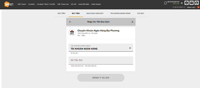 Người chơi cần phải nhập đầy đủ thông tin theo yêu cầu của hệ thống. Sau đó bạn nhập số tiền muốn rút và bấm vào ô “Chuyển” là hoàn tất. Bây giờ chỉ cần chờ hệ thống 188Bet xác nhận và chuyển tiền vào tài khoản ngân hàng cho bạn.