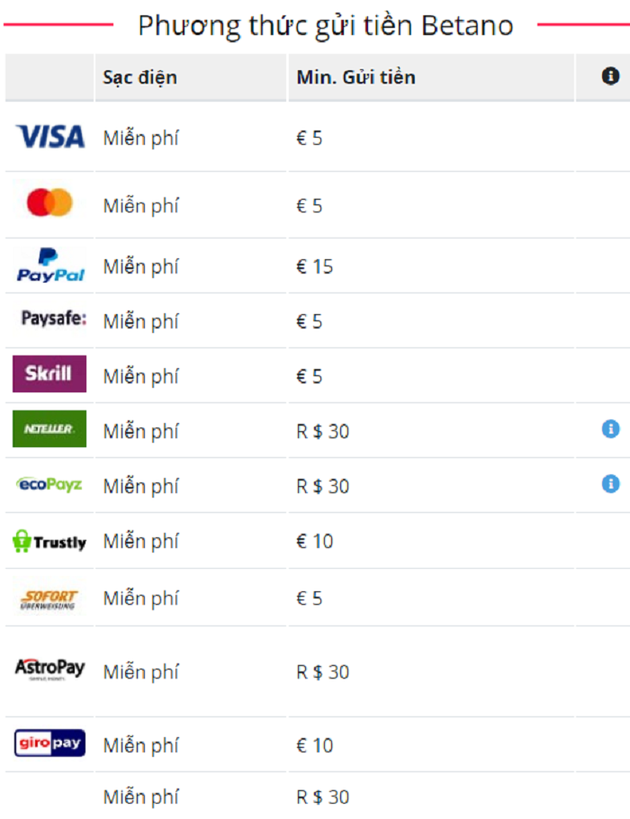 - Nhà cái Betano sẽ không trừ bất kỳ khoản phí nào của người chơi khi bạn thực hiện nạp tiền. Mọi thao tác đều là miễn phí.
