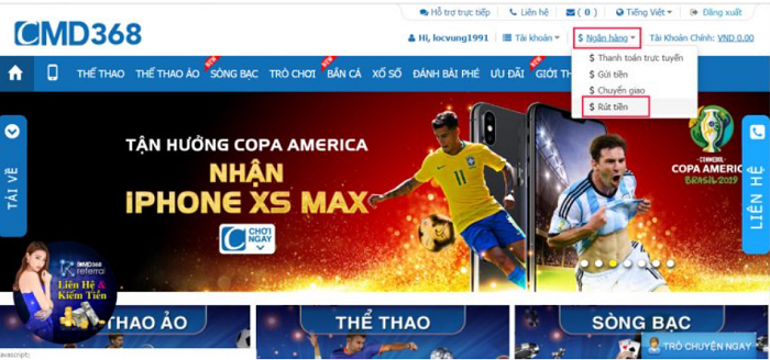 Bước 1: truy cập website nhà cái CMD368 ⇒ đăng nhập vào tài khoản cá nhân ⇒ Rút tiền