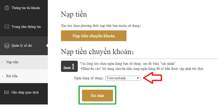 - Hình thức nạp tiền: chọn hình thức bạn nạp tiền (chuyển khoản ngân hàng, chuyển khoản tại máy ATM, nạp trực tiếp tại quầy giao dịch ngân hàng, internet banking….)