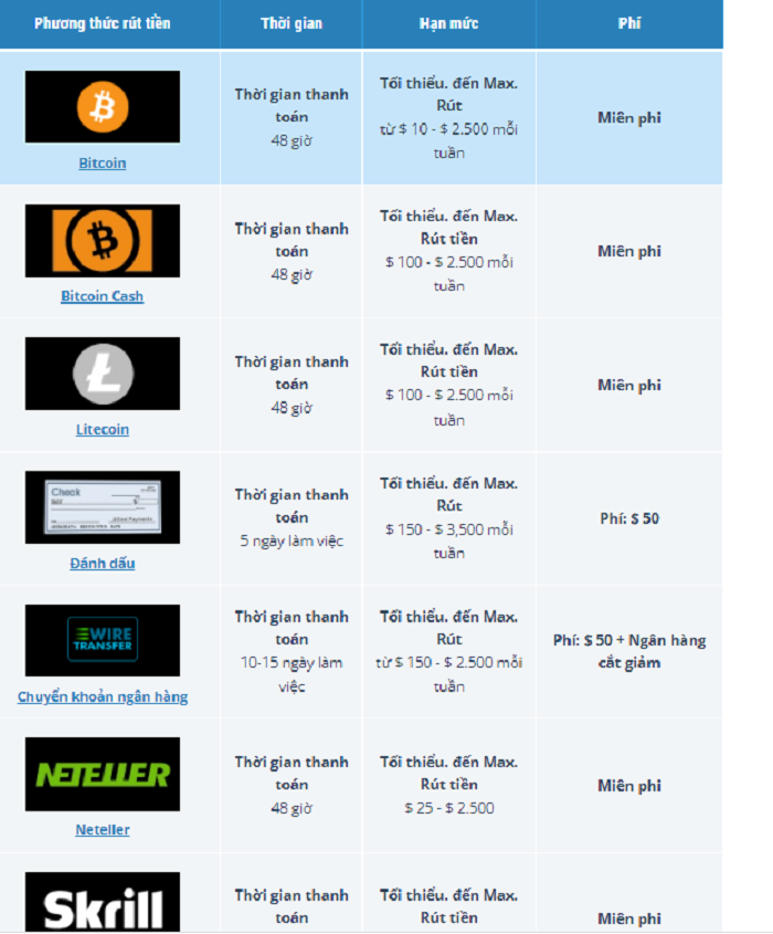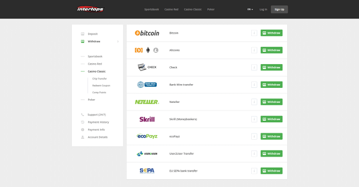 Bạn cũng có nhiều phương thức rút tiền theo ý muốn khi thắng cược. Intertops sẽ cho phép bạn chọn từ Bitcoin, các loại tiền thay thế như Bitcoin Cash và Litecoin, séc, chuyển khoản ngân hàng, Neteller, Skrill, ecoPayz, User User và SEPA cho người dùng EU. Crypto là một lựa chọn rất tốt, vì bạn có thể rút bất cứ thứ gì từ 100 $ đến 2.500 $ mỗi tuần mà không phải chịu bất kỳ chi phí rút tiền nào và thời gian chuyển là 48 giờ.
