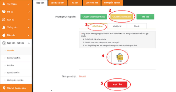 Bước 1: truy cập website nhà cái ⇒ Đăng nhập vào tài khoản ⇒ chọn Nạp tiền => Chuyển khoản nhanh ⇒ ATM Online ⇒ Nạp tiền.