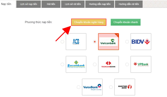 Bước 2: Chọn ngân hàng của nhà cái để thực hiện chuyển tiền và nhấn Nạp Tiền