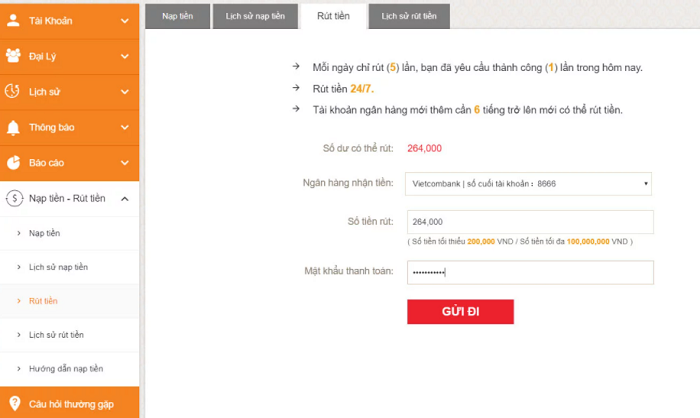 - Số tiền rút/nạp tối thiểu là 200.000 đ.