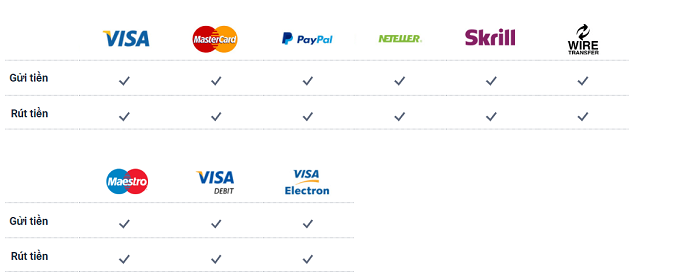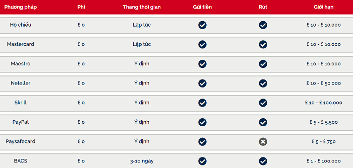 Tiền gửi có thể được thực hiện bằng nhiều loại thẻ Ghi nợ. Các điều khoản và điều kiện tương tự được đính kèm với mỗi phương thức – khoản tiền gửi tối thiểu là £ 5, thời gian xử lý tức thì và không có phí áp dụng.