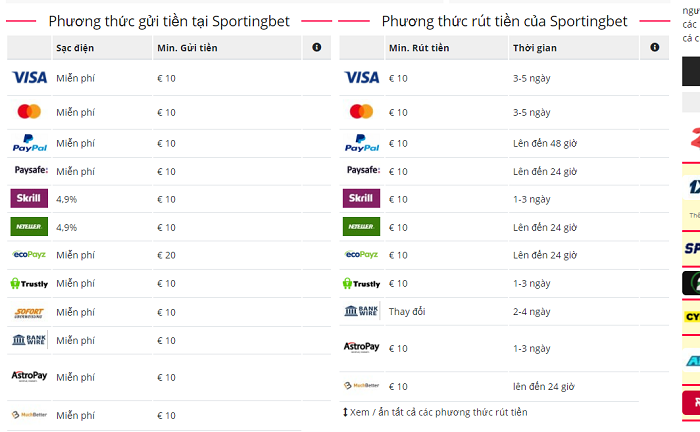 Sportingbet hỗ trợ nhiều phương thức thanh toán phổ biến hiện nay và đa số là không mất phí. Tại đây có tốc độ giao dịch nhanh chóng, xử lý và cập nhật trong vòng 30s với nạp tiền, còn với rút tiền sẽ từ 24 đến 48 tiếng đồng hồ.