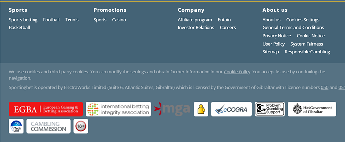 Sportingbet được cấp phép bởi cả Ủy ban cờ bạc Vương quốc Anh và Ủy ban cờ bạc Gibraltar, có nghĩa là người chơi có thể yên tâm về trải nghiệm chơi trò chơi an toàn, bảo mật và công bằng, với sự trợ giúp của trang web này bởi các cơ quan quản lý nói trên.