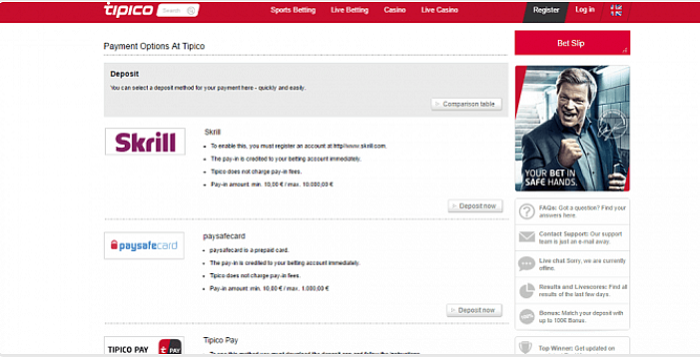 Số tiền gửi tối thiểu là € 10 trong khi số tiền tối đa bạn có thể gửi vào tài khoản được giới hạn ở mức € 1.000. Tiền sẽ có sẵn ngay lập tức và bạn sẽ không bị tính thêm bất kỳ khoản phí nào. Số tiền bạn đã chuyển đến Tipico bằng thẻ Paysafecard sẽ ngay lập tức có trong tài khoản của bạn.