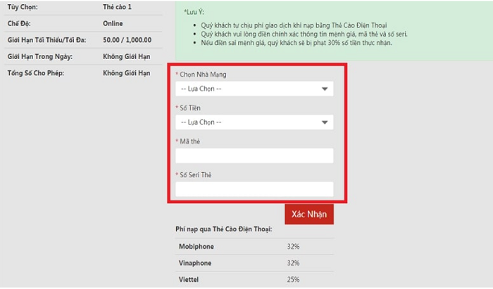 - Nhà mạng: Chọn một trong số các nhà mạng được nhà cái cung cấp: Viettel, Vinaphone hay Mobiphone