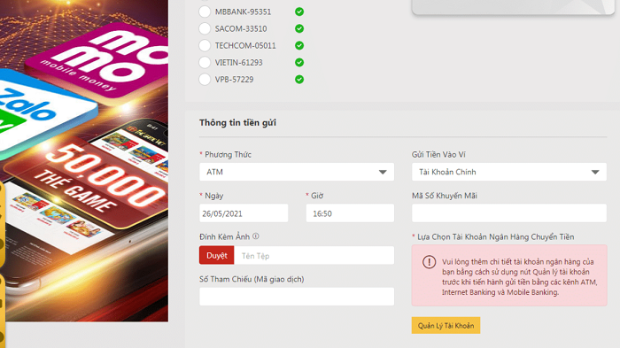 - Phương thức: Chọn phương thức nạp tiền như: chuyển khoản, ATM hay gửi tiền tại quầy giao dịch.