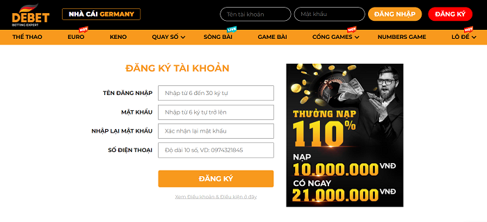 Để tận hưởng được những tất cả ưu điểm tuyệt vời của nhà cái này thì người chơi cần phải có tài khoản tại Debet, hôm nay website nhà cái uy tín Euro888 sẽ hướng dẫn các bạn cách đăng ký tài khoản nhà cái Debet một cách dễ dàng và nhanh chóng!