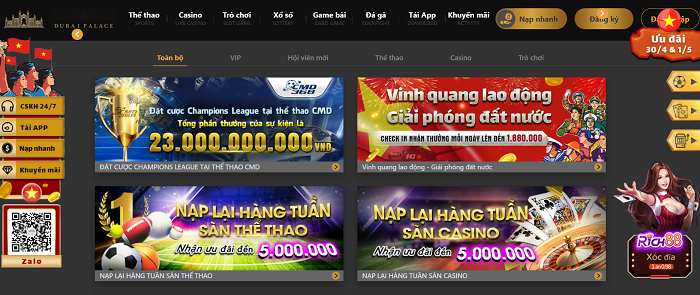 Dubai Palace là một nhà cái uy tín sở hữu lượng người chơi đông đảo hàng đầu hiện nay, nó luôn có chỗ đứng vững chắc trên thị trường đầy cạnh tranh này. Không chỉ là một sân chơi cá cược giải trí trực tuyến mà còn là một nơi giúp anh em kiếm thêm thu nhập mỗi ngày.