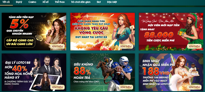 Bên cạnh đó Loto188 còn có ưu điểm nổi bật là thường xuyên tung ra nhiều khuyến mãi hấp dẫn. Khuyến mãi Loto188 được triển khai thường xuyên với nhiều chương trình hấp dẫn dành cho người chơi, mang đến cho người chơi sự trải nghiệm và giải trí tuyệt vời nhất.