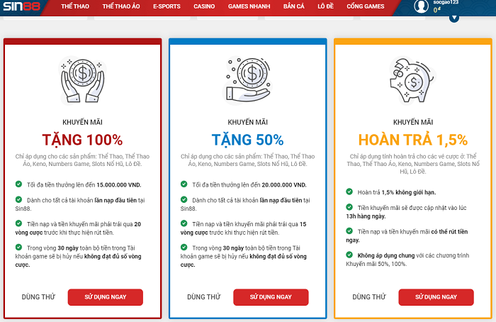 Các chương trình khuyến mãi trên Sin88