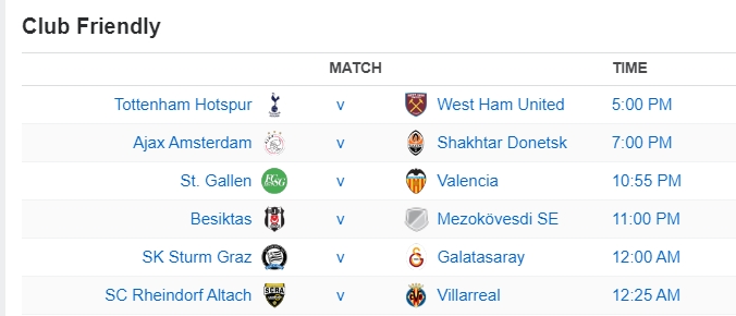 Một loạt các trận đấu giao hữu hấp dẫn sẽ diễn ra trong hôm nay: Tottenham vs West Ham, Ajax vs Shakhtar, St Gallen vs Valencia,… ngoài ra còn có vòng loại Champions League. Tất cả đều được nhà cái uy tín cập nhật trong lịch thi đấu bóng đá.