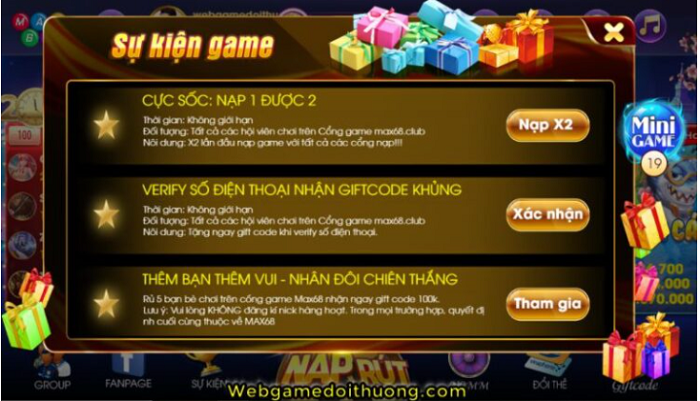 Ngoài ra, Max68 Club còn thường xuyên tung ra các chương trình khuyến mãi cho Người chơi mới cũng như thành viên Vip. Sự kiện tặng Code hay các chương trình khuyến mãi nạp thẻ đều được cập nhật thông tin tại Fanpage chính thức của cổng game để người chơi chủ động theo dõi.