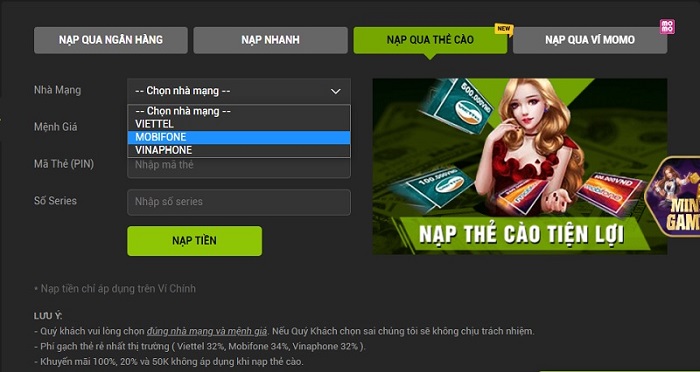 • Chọn nhà mạng phù hợp: người chơi có thể chọn các mạng như: Viettel, Mobifone, Vinaphone.