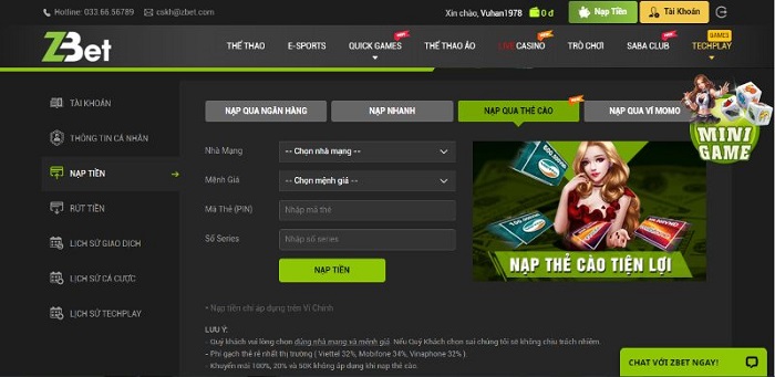 Cách thức nạp tiền tại Zbet