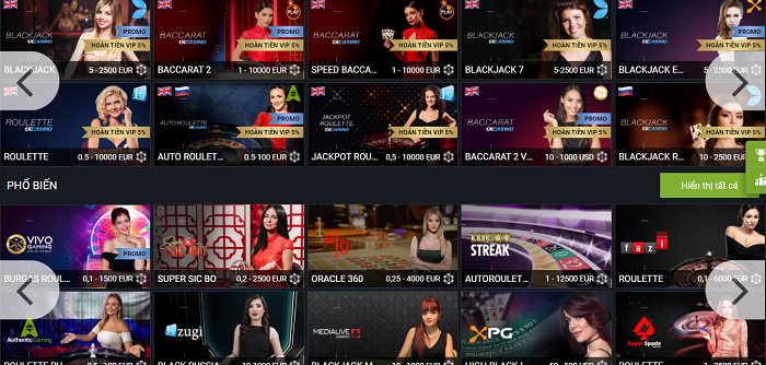 Đây cũng là trò chơi nhận được sự quan tâm lớn của người chơi: Poker, Baccarat, Roulette, Blackjack, Rồng Hổ. Với tiêu chuẩn từ cơ bản đến bản VIP thì thật thú vị khi các trò chơi về Sicbo; Number Game và Lottery xổ số cũng vô cùng hấp dẫn với tỷ lệ ăn cược cực cao.