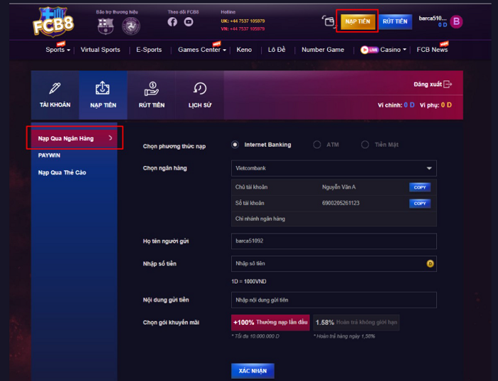 - Chọn ngân hàng: Người chơi chọn ngân hàng muốn chuyển tiền vào. Hệ thống sẽ hiển thị số tài khoản và chủ tài khoản nhận tiền đại diện của Fcb8. Lúc này người chơi copy thông tin và thực hiện chuyển tiền vào tài khoản qua các hình thức chuyển phổ thông (Nạp tiền mặt, Chuyển tại trụ ATM, nạp trực tiếp tại quầy giao dịch ngân hàng)