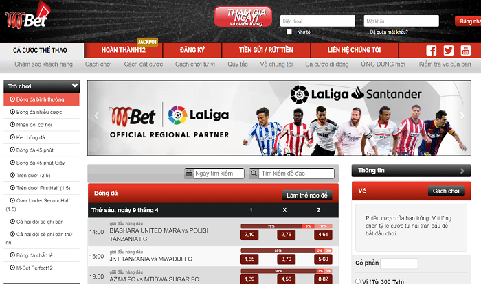 M-Bet là một trang web cá cược thể thao hàng đầu cung cấp nhiều loại thị trường cá cược bóng đá cũng như thể thao ảo cho người chơi cá cược ở Tanzania và các quốc gia thuộc Châu Phi khác. Nhà cái M-Bet ra mắt vào năm 2013 và được điều hành bởi M-Bet, một công ty nổi tiếng tuân thủ luật cờ bạc nghiêm ngặt của Hội đồng quản trị trò chơi của Tanzania