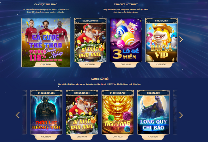 • Giữa giao diện là hình ảnh của những môn cá cược về bóng đá, bóng chuyền, tennis, sòng bài, Nổ hũ,…vô vàn trò chơi đang chờ đợi người chơi ở đây