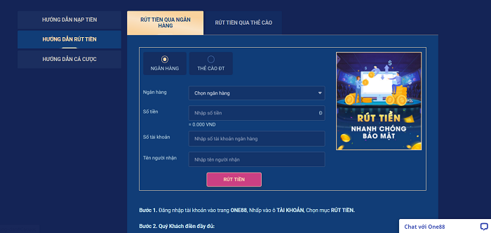 Người chơi có thể lựa chọn một trong hai hình thức rút qua ngân hàng hoặc qua thẻ cào điện thoại