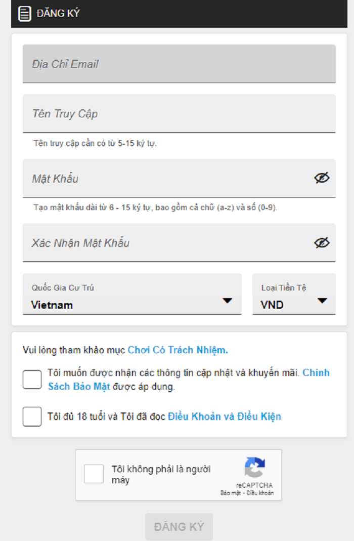• Người chơi tích vào 2 ô “Tôi muốn được nhận các thông tin cập nhật và khuyến mãi”; “Tôi đủ 18 tuổi và đã đọc các điều khoản”