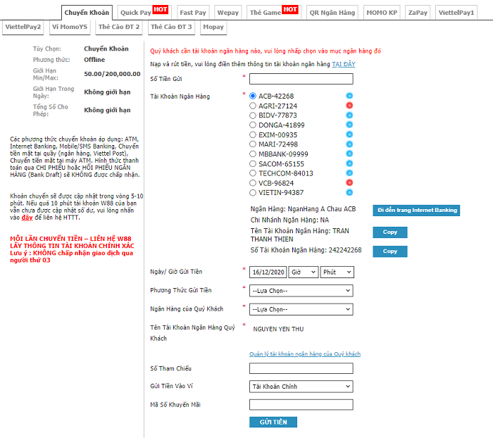 Bước 2: Chuyển tiền vào tài khoản ngân hàng do W88 cung cấp.