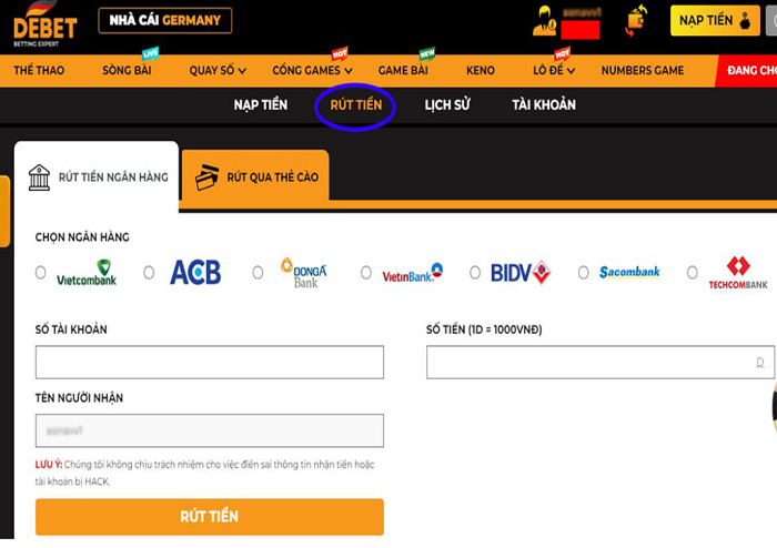 Người chơi truy cập vào website nhà cái Debet, đăng nhập vào tài khoản cá nhân của bạn, sau đó bấm chọn ô Rút Tiền trên giao diện